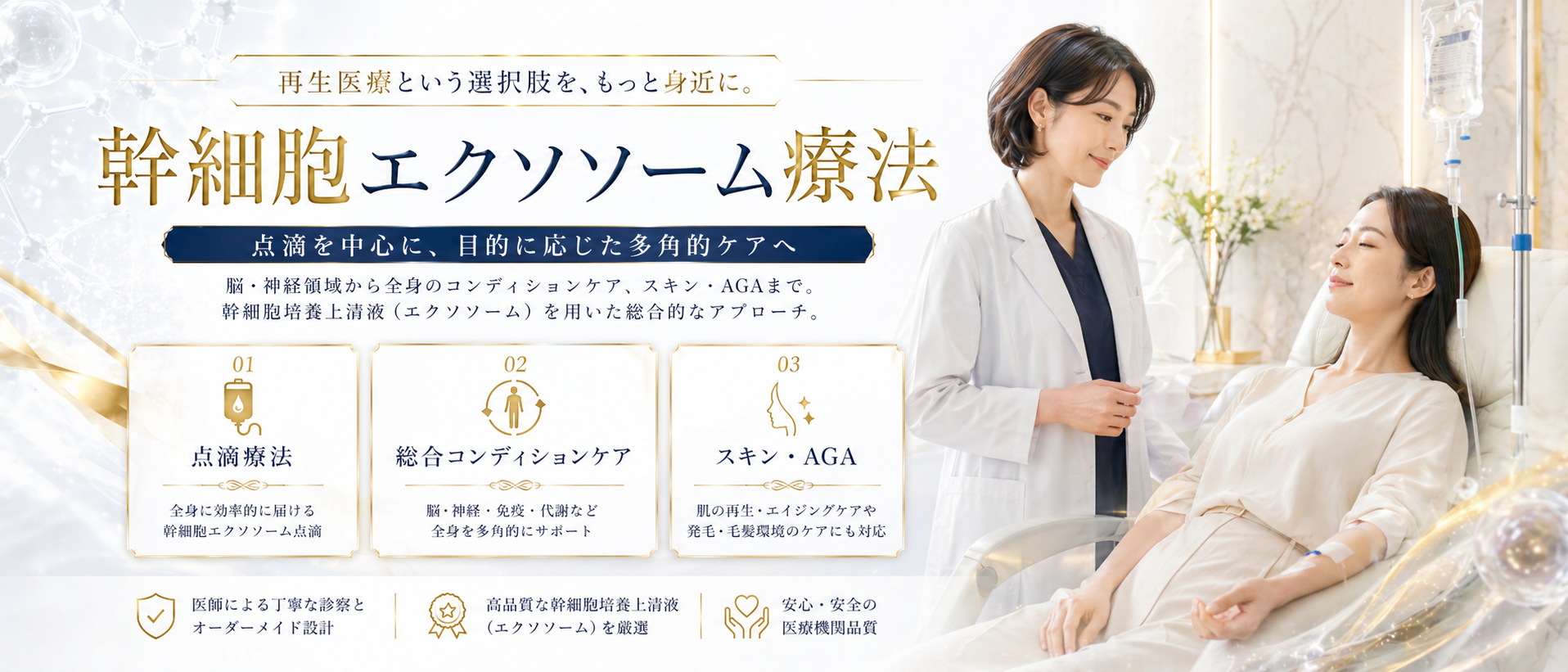 | 注意事項 | 妊娠の可能性がある場合は、この治療をお受けになることはできません。必ず医師へご申告ください。お困りの症状の内容や治療中の病気によっては使用できない場合もあります。現在治療中の病気やこれまでかかった病気、使用中の薬などがあれば、医師にご申告ください。2006年10月10日に厚生労働省から、プラセンタ(ヒト由来プラセンタ製剤)を注射された方は献血を控えるように通達が出ております。同様に生物製剤である幹細胞エクソソームについても点滴治療を受けた方は以降の献血は控えるようにお願いいたします。 |